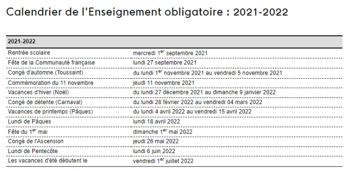 CALENDRIER SCOLAIRE BELGIQUE. #2022