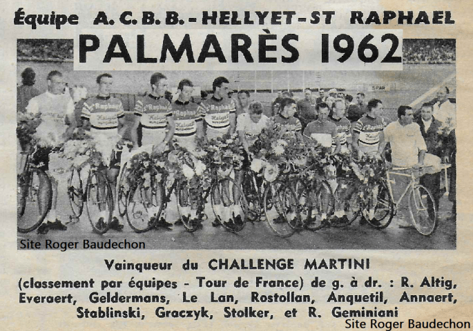 Photo. L'équipe "A.C.B.B-HELLYET-ST RAPHAEL" remporte le challenge. Alors que d'un côté, Renato LONGO remportait le 11e "CRITERIUM MARTINI". Qui était une course de cyclocross mais très importante. L'équipe "A.C.B.B-HELLYET-ST RAPHAEL" remportait le classement des équipes sur le "TOUR DE FRANCE" 1962. Ce classement était intitulé : "CHALLENGE MARTINI". La seconde équipe fut : "MERCIER-BP-HUTCHINSON" et … Lire la suite « CHALLENGE MARTINI ». #TDF #1962 #2022