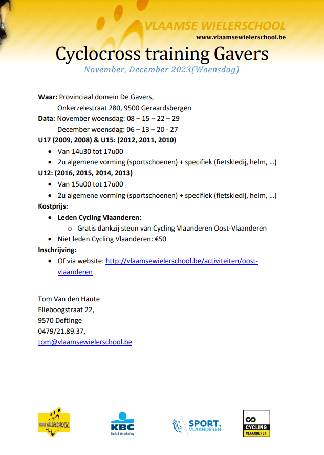 Affiche "CYCLING VLAANDEREN". La saison de CYCLO-CROSS - entraînements - est sur les rails. La "WIELERSCHOOL" - qui proposait des compétitions près de l'ancienne gendarmerie et ensuite, au "Kasteel Izegrim" est connue (1970-1980-1990) de nombreux "frontaliers" - relance ses activités à partir du 08 NOVEMBRE 2023. Ouvert à tous !!! La saison - entrainements - … Lire la suite ENTRAÎNEMENTS – CYCLO-CROSS – CAT U12/U15/U17. #Nov/Déc #2023