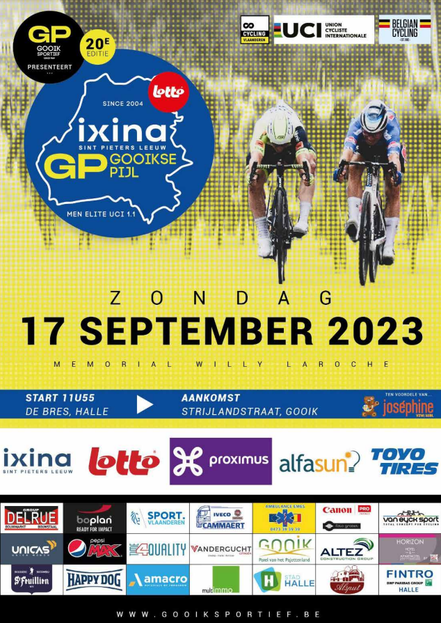 Affiche organisateur. Après la "SUPER 8 CLASSIC", place à la "GOOIKSE PIJL". Le week-end sera animé. Il s'agira de la 20e édition pour la "FLÈCHE DE GOOIK". Voici quelques informations à ce sujet. La brochure de l'organisateur est en NL/FR/ANG. Modalités pratiques. Départ de HALLE à 11h55. (dans le centre, en bord des parkings et … Lire la suite « IXINA GP GOOIKSE PIJL ». #1.1 #ToutOuPresqueSurL’Epreuve #17/09 #2023