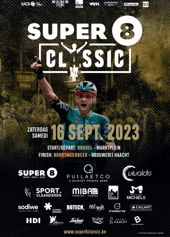 Affiche organisateur. La "SUPER 8 CLASSIC" démarre de la Place de Brakel. Elle se termine devant la brasserie Haacht à Boortmeerbeek. Une "CLASSIC" dédiée aux anciens champions IMPANIS et VAN PETEGEM. Auquel est associé J DE VROE (+) le fondateur de l'épreuve. Le parcours fait souvent la part belle à notre région car, comme pour … Lire la suite « SUPER 8 CLASSIC ». #Brakel-Haacht #ToutOuPresqueSurL’Epreuve #16/09 #2023