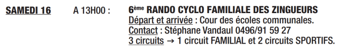 Texte explicatif. Samedi 16 septembre, "LA RANDONNÉE DES ZINGUEURS" s'incère dans le programme de la "KERMESSE DES RUES CULANTS, DUVAL et BONNE NUIT" à Deux-Acren. (14 au 19/09/2023) Un circuit familial de 25 km. Et deux départs sur un même parcours de 65 km. Le premier est accessible à tous. Les deux autres sont destinés … Lire la suite « LA RANDONNÉE DES ZINGUEURS ». #Deux-Acren #16/09 #2023