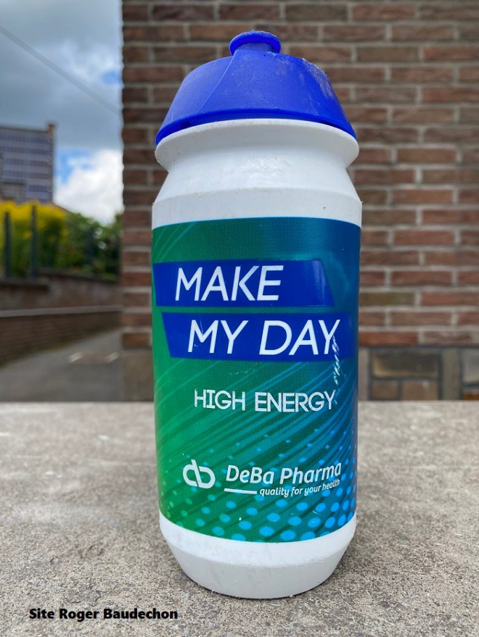 Photo. 2023 Ce bidon se trouvait sur le circuit de l'ET 3 du "RVOV" à POLLARE. Il s'agit d'un accessoire "MAKE MY DAY" - complément alimentaire - de la firme "DEBA PHARMA" (Courtrai). Celle-ci figure sur le cuissard de l'équipe "DOVY-KEUKENS - FCC". Plusieurs clichés montrent qu'il est utilisé par ce team. Même si ce … Lire la suite BIDON « DOVY KEUKENS – FCC ». #2023.