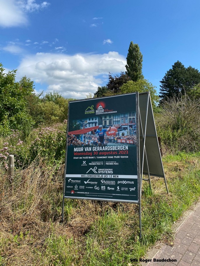 Photo. Les panneaux publicitaires sont légion dans l'entité de Grammont. "MUUR VAN GERAARDSBERGEN" ou "MUUR CLASSIC STADSPRIJS GERAARDSBERGEN", au choix. Abandon d'une kermesse pour une 1.2. Un rappel de l'ancien nom associé au nouveau. Tout sur cette épreuve dans quelques jours. "LCOW" pourrait y être. (rentrée des classes en Wallonie)