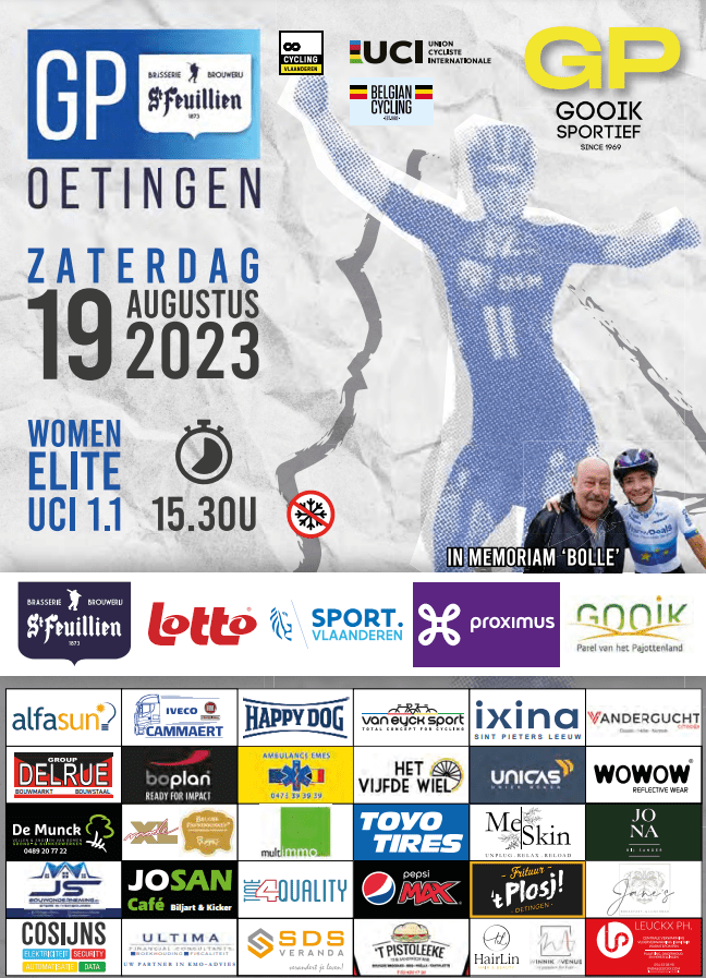 Affiche organisateur. Samedi 19 août, les dames ont rendez-vous à OETINGEN. Le "GP" est classé en ELITES 1.1. Elle est très courue par les compétitrices. Une organisation de "GOOIK SPORTIEF". Qui montera sur la première marche du podium après BALSAMO et WIEBES pour la troisième édition ? Modalités pratiques. Podium de présentation sur la Place … Lire la suite « GP OETINGEN ». #+Résultat #Dames #ToutOuPresqueSurL’Epreuve #19/08 #2023