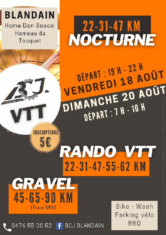 Affiche organisateur. Le "BCJ BLANDAIN" organise sa NOCTURNE, le 18/08 et sa JOURNÉE, le 20/08. Huit distances au choix en fonction de : VTT ou GRAVEL. Gravel = trace GPX. Départ du HOME DON BOSCO à BLANDAIN de 19h00 à 22h00 le vendredi et de 07h00 à 10h00, le dimanche.