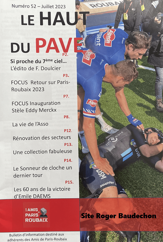 Photo. Entête du bulletin d'information de juillet. La dernière brochure des "AMIS DE PARIS-ROUBAIX" a été postée le 27/07/23 (France). Elle était dans notre boîte aux lettres en date du 02/08/23 (Belgique). Quelques jours plus tard, nous apprendrons la triste nouvelle (05/08/23). François DOULCIER (Président) est mort durant ses vacances à l'âge de 58 ans. … Lire la suite « LE HAUT DU PAVÉ ». #Brochure #LesAmisDeParis-Roubaix #Juillet #2023