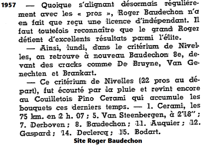 Photo. Article du journal "LE POSTILLON" lessinois du 31/08/1957. Merci à M-CD pour les derniers envois. Après le CRITÉRIUM DE VILVORDE placé voici quelques mois, au tour du CRITÉRIUM DE NIVELLES 1957. Le CRITÉRIUM DE NIVELLES s'est probablement déroulé le lundi 26 août 1957. Roger BAUDECHON était "AMATEUR INTERNATIONAL" (EL SC-ESP). Mais il avait une … Lire la suite CRITÉRIUM DE NIVELLES 1957. #2023