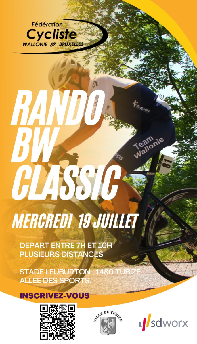 Affiche organisateur. Des compétitions pour dames et messieurs se dérouleront à TUBIZE mercredi prochain. Mais si vous le souhaitez, il est possible d'effectuer des randonnées cyclos de : 30 - 80 km. Inscriptions au "STADE LEBURTON" - 07 à 10h. Toutes informations sur "FCWB" ou "BELGIAN CYCLING". Organisateur "TUBIZYCLIC" (club pour les jeunes). Prévoyez de … Lire la suite POUR SE METTRE EN JAMBES. #RandoBWClassic #Cyclos #19/07 #2023