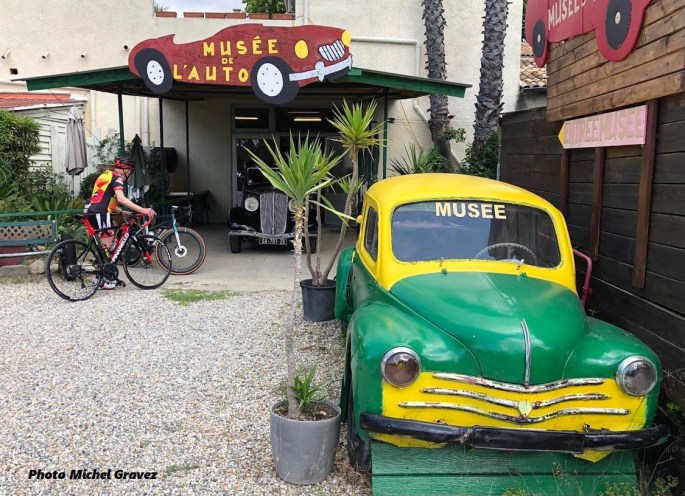 Pendant ce temps-là, MichelG visite le "MUSÉE DE L'AUTOMOBILE" - "LE TACOT" à AIGUES-MORTES (Camargue). #AVosVélos >>> Un cyclo a l'air plus intéressé par son vélo que par les bagnoles !!!