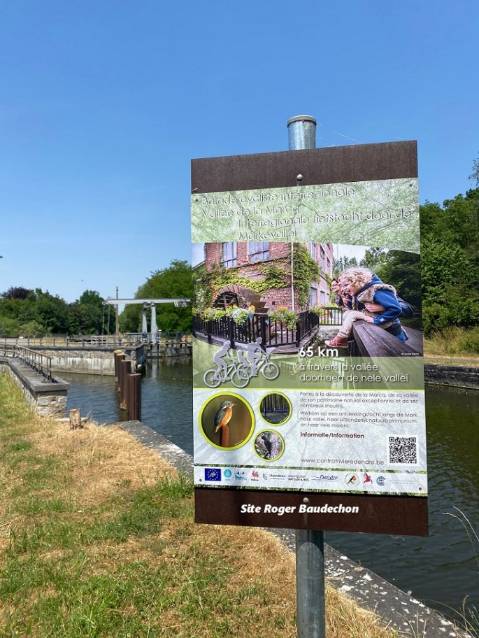 A hauteur des écluses de Lessines, un panneau vous invite à effectuer une balade cycliste interrégionale : "VALLÉE DE LA MARCQ" - 65 km. #AVosVélos!!! #SiteContratRivièreDendre