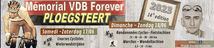 Affiche organisateur. PLOEGSTEERT se souvient. Deux journées sportives ont lieu dans la localité. Elles sont dédiées à Frank VANDENBROUCKE. Dimanche > Marche et cyclotourisme. Voyez l'affiche ou visitez la page "FB" pour en savoir plus. Résultats des courses. (samedi) Débutants. 28P 1 VAN STEENLANDT 2 PETILLON V 3 D HOLLANDER ... 4 VANASSCHE 7 CARDINAL … Lire la suite C’EST LE WEEK-END « MÉMORIAL VDB FOREVER » !!! #+Résultats 17-18/06 #2023