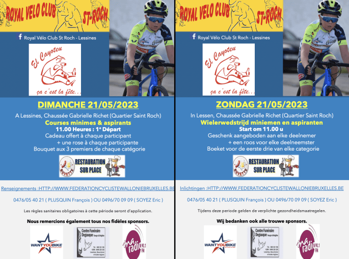 Le 21/05, les minimes et aspirants seront à la Chaussée Gabrielle Richet - Lessines. L'Administration Communale a annoncé les mesures relatives à la mobilité sur son site et sur "FB". Cette fois, les cyclistes auront également un CLM en ouverture. Plusieurs régionaux seront sur les différents départs. Supporters, tous au poste !!!