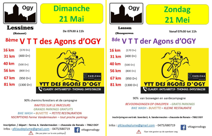 Le "VTT DES AGONS D'OGY" s'annonce chaud !!! Ce 21/05, c'est matinalement que les vététistes ont rendez-vous à OGY pour le traditionnel VTT. Vers le "Pays des Collines".