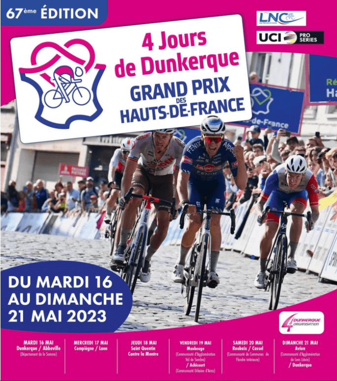 Affiche organisateur. Mais que voilà une très belle épreuve !!! "LES 4 JOURS DE DUNKERQUE-GP DES HAUTS DE FRANCE" sont organisés du 16 au 21 mai 2023. Six étapes attendent les amateurs. "LCOW" pourrait être au départ du "Clair de Lune" à MAUBEUGE (vendredi). Souhaitons que la météo soit meilleure qu'elle ne l'est en ce … Lire la suite « LES 4 JOURS DE DUNKERQUE ». #+Résultats #16-21/05 #2023