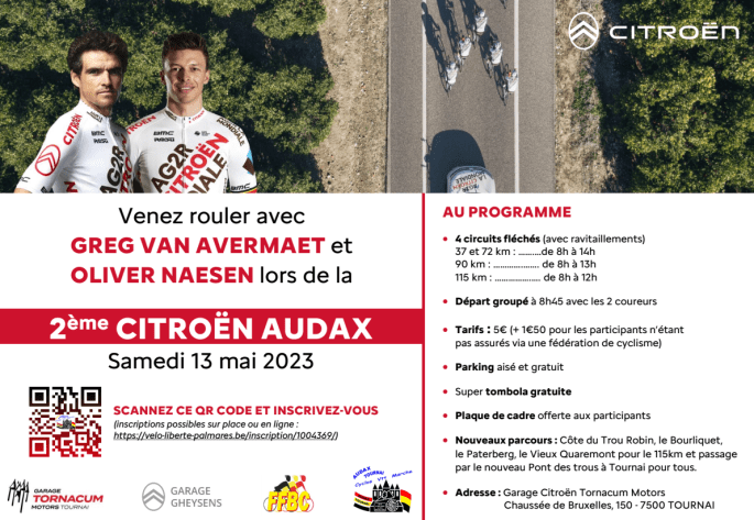 Affiche organisateur. Le week-end de fin de vacances scolaires sera TRÈS chargé !!! Samedi 13 mai, les "AUDAX TOURNAI" organise la "2e CITROËN". Plusieurs distances possibles : 35-63-80-110 km. Notez que c'est différent sur l'affiche et sur le site de la FFBC. Départ entre 08h00 et 14h00 suivant le kilométrage choisi. Inscriptions >>> "GARAGE CITROËN … Lire la suite « LA CITROËN ». #Cyclos #AudaxTournai #13/05 #2023