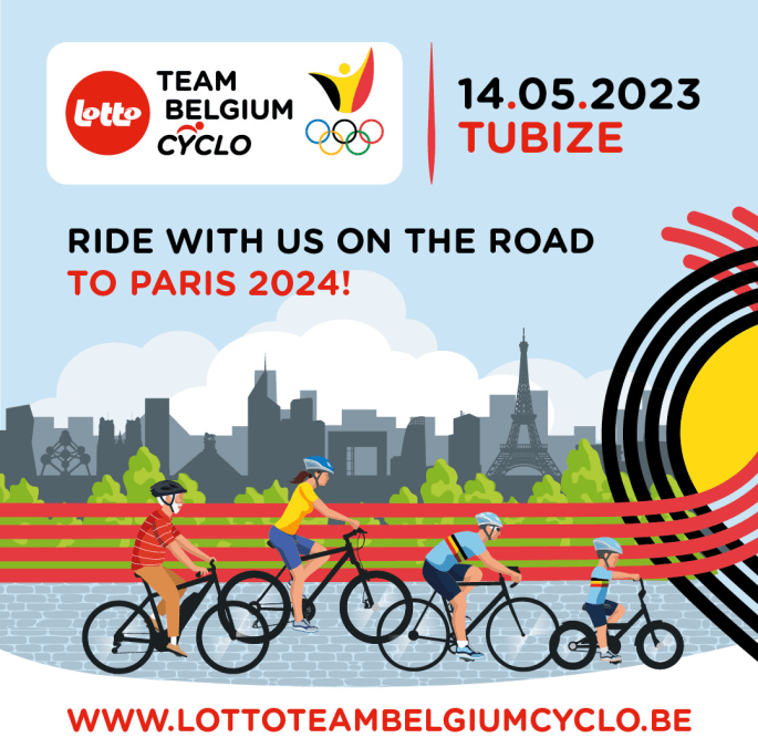 Affiche organisateur. Tout concernant cet événement sur le site de "LOTTOTEAMBELGIUMCYCLO". Trois distances : 30-60-100 km. La rencontre avec d'anciens et de nouveaux athlètes olympiques. Le tout dans les locaux de "BELGIAN CYCLING" et de "LA FÉDÉRATION DE FOOTBALL". Inscriptions de 07h30 à 14h00. Parking dans les infrastructures. Une organisation de "PELOTON". Lien >>> https://lottoteambelgiumcyclo.be/fr/