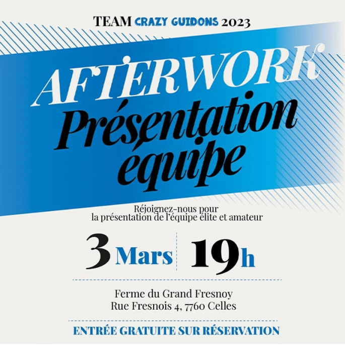 Affiche organisateur. Le 03 mars 2023, les "CRAZY GUIDONS" seront présentés au public et à la presse. La "FERME DU GRAND FRESNOY" située dans la commune de CELLES a été retenue pour l'occasion. Le rendez-vous est fixé à 19h00. #Afterwork #CyclesPicoux Entrée gratuite MAIS réservation obligatoire. Toutes les formalités sont disponibles sur la page "FB" … Lire la suite PRÉSENTATION DES « CRAZY GUIDONS ». #Ath #03/03 #2023