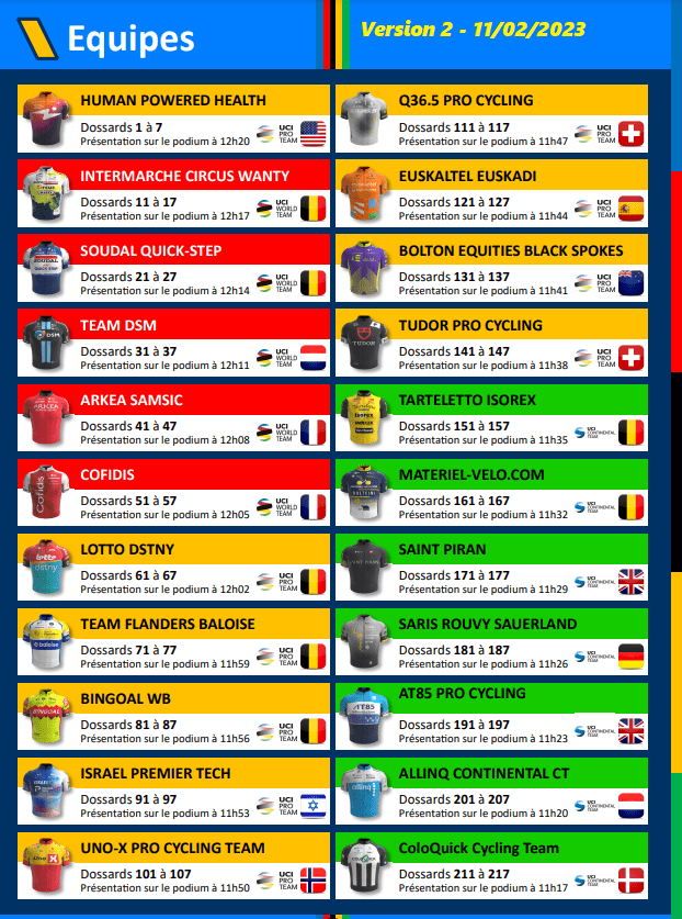 Mise à jour. Le 11/02/2023. Photo. Mise à jour des équipes. Nous remercions Mr G.BULTEAU pour les informations transmises. L'équipe "COFIDIS" a confirmé son inscription. Une "WT" de plus pour le "GP". Par contre, l'équipe "BÉNÉDICTION KITEI PRO 2020" ne fait plus partie des participantes. Voici la liste provisoire : Les motifs appartiennent à l'ECA. … Lire la suite DERNIÈRES NOUVELLES. #GP-CRIQ #04/03 #2022