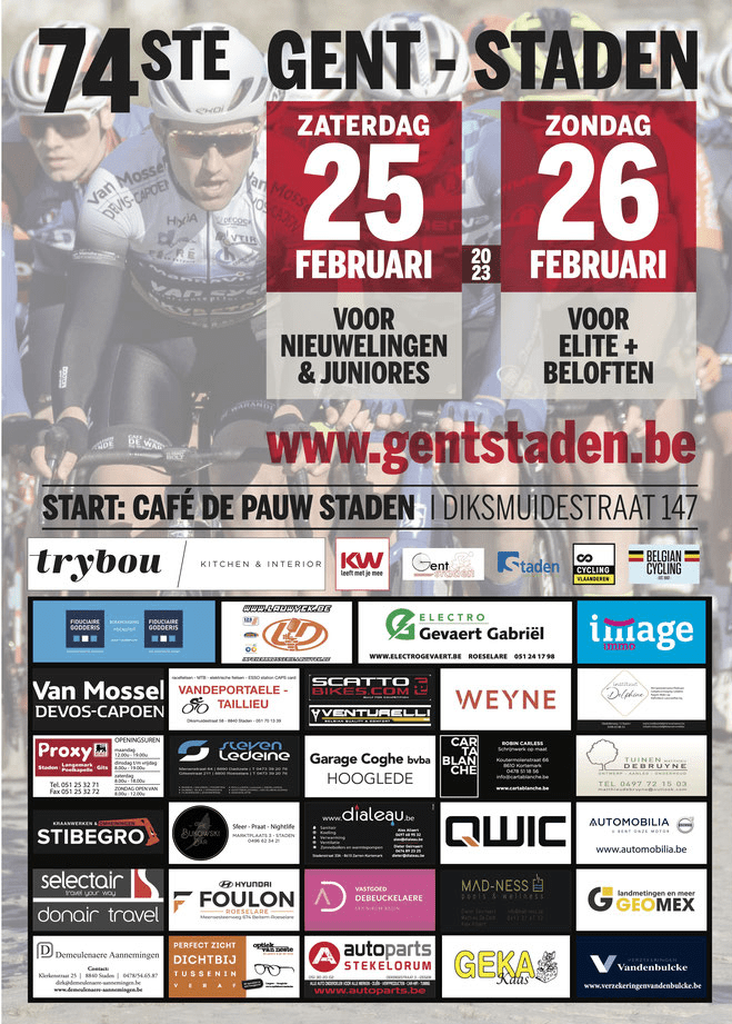 Affiche organisateur. Par le passé, les courses gantoises étaient très nombreuses à ouvrir la nouvelle saison. Il reste "GENT-STADEN" qui attire toutes les convoitises. En effet, le coursier DÉBUTANT, JUNIOR, EL SC et ESP qui l'emporte, voit son nom écrit en caractères gras, en première page des journaux. Un bon coup de pub pour les … Lire la suite « GENT-STADEN ». #25-26/02 #+Résultats #2023