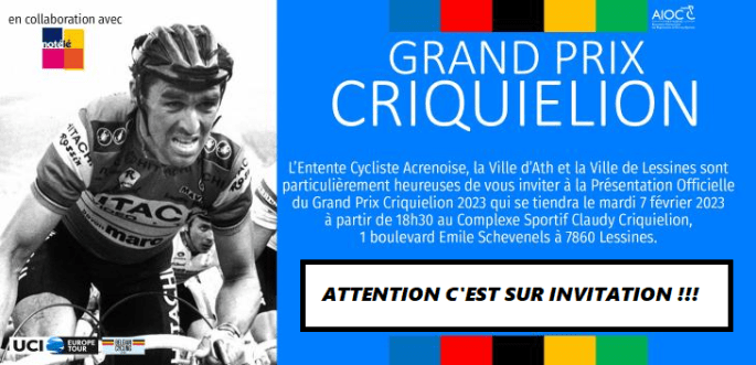 Mis à jour. La présentation officielle du "GP CRIQUIELION" se tiendra à Lessines, en date du 07 FÉVRIER 2023. Un retour est envisagé dans la semaine. Il nous semble bon de préciser que la soirée est accessible sur INVITATION et RÉSERVATION. Uniquement !!! Un accueil/filtre est organisé à l'entrée. Plusieurs posts en ligne au 09/02/2023. … Lire la suite PRÉSENTATION OFFICIELLE DU « GP CRIQUIELION ». #07/02 #2023