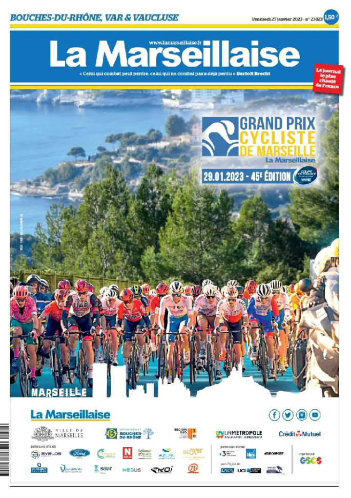Affiche organisateur (en fait, le journal) Lisez la devise sous le titre. Le "GP LA MARSEILLAISE" va nous réserver un beau spectacle. Le 29 JANVIER, c'est sur "FR 3" PACA , "EUROSPORT" ... et sur le net que nous pourrons suivre l'événement. A moins d'être sur place. 167,9 km attendent les coursiers. Départ : 12h15. … Lire la suite « GRAND PRIX CYCLISTE DE MARSEILLE ». #+Résultats #LaMarseillaise #29/01 #2023