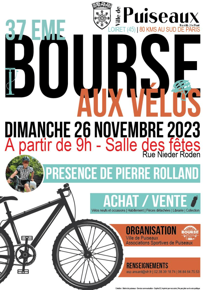 L'affiche envoyée par l'organisateur. PUISEAUX. Commune française ("Le Loiret") qui se situe à environ 80 km de Paris. Elle est entourée de PHITIVIERS et de NEMOURS. A voir, le clocher tors de Puiseaux (+ Halle, Mairie, ... .) Si vous comptez loger sur place, il y a des gîtes, maisons d'hébergement et des hôtels - … Lire la suite BOURSE AUX VÉLOS DE PUISEAUX (Loiret-France). #26/11 #2023