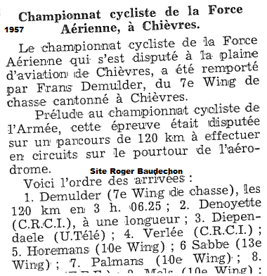 Photo. Article extrait du journal "LE POSTILLON" (1957). Envoyé par M-ChD. Merci. Le 03 août 1957, l'article était publié dans "LE POSTILLON" (journal local). Le 24 juillet 1957, la base aérienne de CHIÉVRES fut le théâtre du "CHAMPIONNAT DE LA FORCE AÉRIENNE". Dans le public, le Major BLADT - Commandant du groupe de vol de … Lire la suite « LE CHAMPIONNAT CYCLISTE DE LA FORCE AÉRIENNE ». #Chièvres #1957 #1er DE MULDER #2023