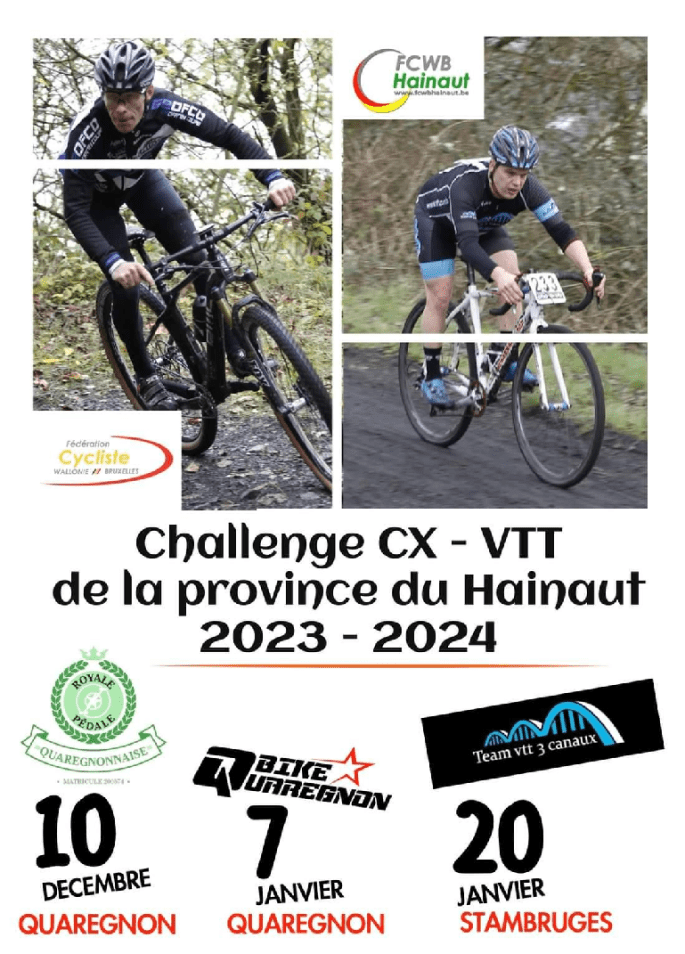 Affiche envoyée par DavidL. Merci. Hier, nous vous parlions du SUPER VTT qui sera organisé à BRUXELLES, le 27/01/24 (08-14). Ce jour, nous vous présentons les épreuves hennuyères de la "FCWB" : 10 DÉCEMBRE 23 à QUAREGNON. Par la "ROYALE PEDALE QUAREGNONNAISE". Toutes infos déjà sur le site de la FCWB et HT. 07 JANVIER … Lire la suite A VOS AGENDAS. #VttChallengeCX/VTT #2023-2024 #2023