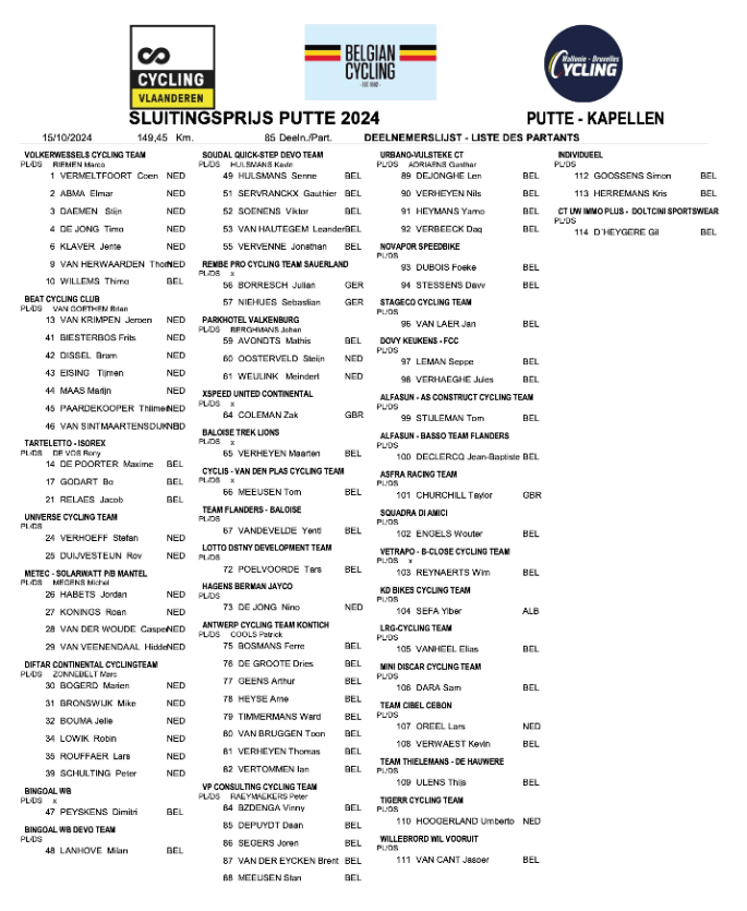 📱La liste du jour. Avec PUTTE-KAPELLEN, nous abordons le tout dernier virage routier de la saison. Classement ci-dessous en soirée. >>> 158 km - 85 partants (c'est exceptionnellement peu). "ATV" devrait donner des images. Classement. 1 DE JONG 2 SEFA 3 SCHULTING 4 AVONDTS 5 SEGERS 6 VAN HAUTEGEM 7 POELVOORDE 8 VAN DER WOUDE … Lire la suite LA DER DE LA SAISON. PUTTE/KAPELLEN KOERS. 15/10. + RESULTAT. ▶2024