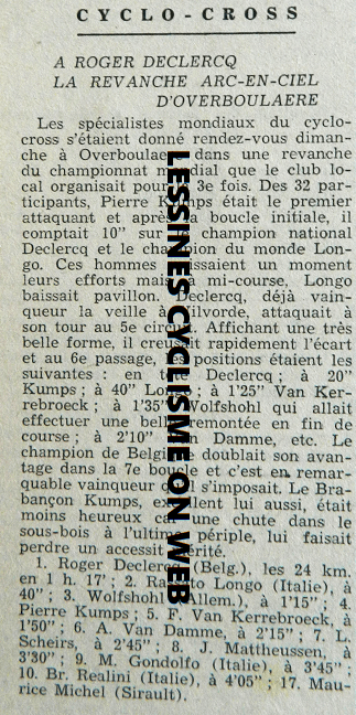 📱Documents personnels. Article du journal "LE POSITILLON" lessinois de 1962. WOLFSHOHL a participé à la revanche des MONDIAUX organisée à OVERBOELARE (localité touchant à Deux-Acren) Rolf WOLFSHOHL (All-✝ 85 ans) est décédé récemment. Cet illustre coureur allemand fut une véritable star des années 1960-1970. Son pays lui a d'ailleurs décerné le titre de Chevalier de … Lire la suite « SOUVENEZ-VOUS » : ROLF WOLFSHOHL. ▶2024