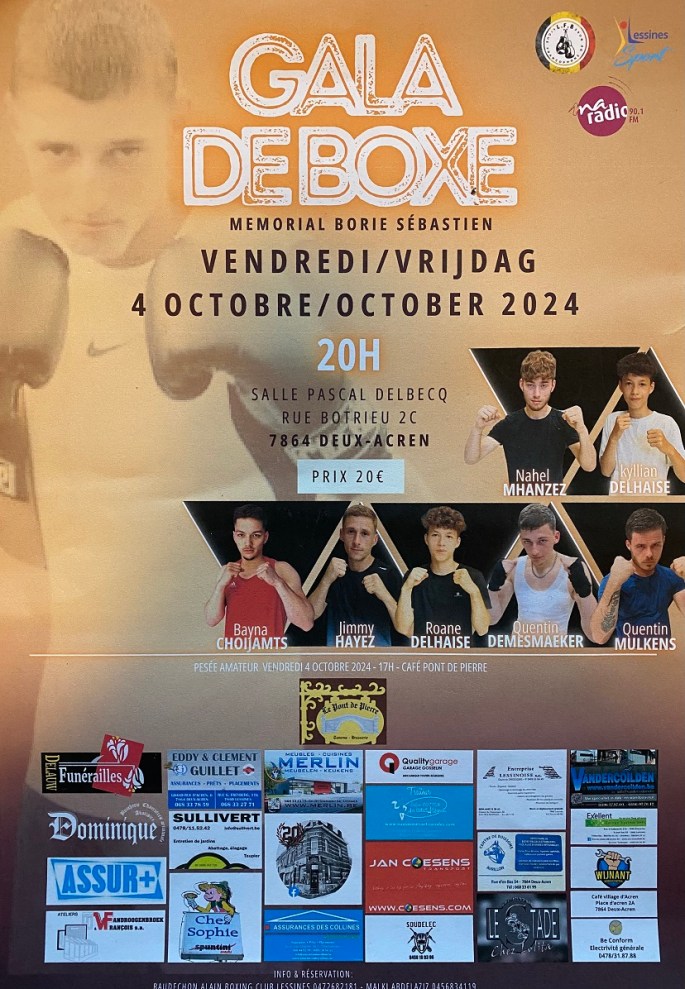 Affiche. (BORIE S est en fond d'affiche sur la gauche). Alain BAUDECHON (cousin) et le "BOXING CLUB LESSINES" ont organisé un "GALA DE BOXE" à DEUX-ACREN. Ce vendredi soir, la "SALLE PASCAL DELBECQ" a accueilli un très nombreux public. Une petite quinzaine de combats mettait en présence une majorité de jeunes du club. L'occasion pour … Lire la suite UN « GALA DE BOXE » EN MEMOIRE DE BORIE SEBASTIEN. 🥊. 2ACREN. 04/10. ▶2024