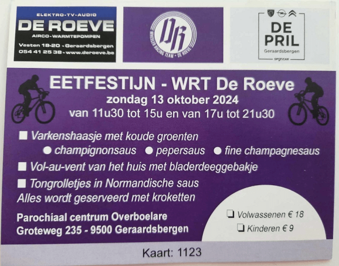 Affiche envoyée par RomuT. RomuT nous demande de bien vouloir annoncer le souper du club dont il est membre. Le "WRT DE ROEVE" de GERAARSBERGEN/GRAMMONT organise son REPAS en date du 13/10. A MIDI et en SOIREE !!! Trois menus possibles : PORC, VOL-AU-VENT ou SOLE. Salle Paroissiale de Overboelare. Voyez l'affiche pour les réservations … Lire la suite SOUPER DES « WRT DE ROEVE ». GRAMMONT/GERAARDSBERGEN. 13/10. ▶2024