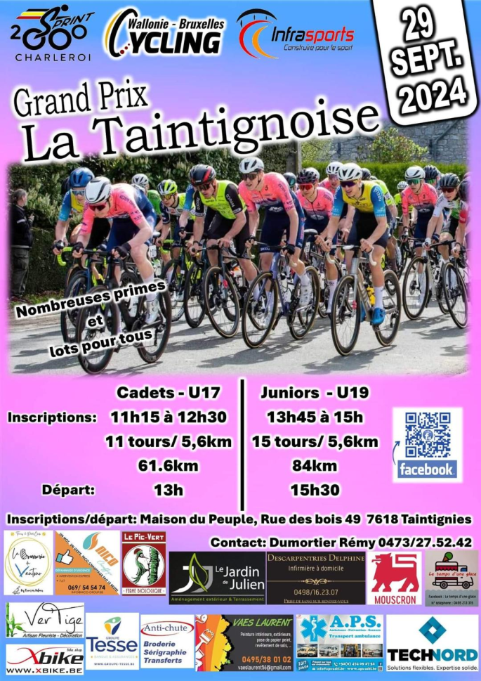 Affiche organisateur envoyée par HaroldD. "SPRINT 2000 CHARLEROI" mettait sur pied une sérieuse journée de cyclisme à TAINTIGNIES. C'était le 29 septembre 2024. CADETS, JUNIORS, DAMES étaient au programme. Le tout, au départ de la "MAISON DU PEUPLE" du village. Un lieu habituel occupé par les "RDD" (cyclos) du Champet'. Une animation qui a attiré … Lire la suite YANIS DUBOIS – 39e A TAINTIGNIES. 29/09. JUN. ▶2024