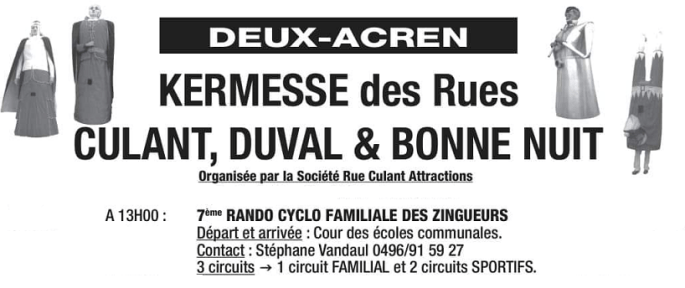 Affiche de DEUX-ACREN transmise par MichelG. Merci à lui. ... mais pour mieux rebondir la semaine prochaine. La dernière quinzaine de septembre va faire des heureux. LESSINES La "7eme RANDO ... CYCLO ... FAMILIALE ... DES ZINGUEURS" est programmée dans le cadre des festivités acrenoises à la date du 14 septembre. Pour plus d'informations, voyez … Lire la suite UN WEEK-END NETTEMENT PLUS CALME … . ▶2024