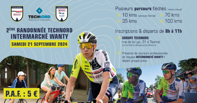 Affiche organisateur envoyée par JhonnyS. Le 21 septembre, "TECHNORD" organise sa seconde journée axée sur la randonnée. Lieu de rendez-vous : TOURNAI. Inscriptions de 08 à 11.00. Le team "INTERMARCHE-WANTY" sera présent !!! Modalités pratiques : Parcours : 10kms (familial), 35 km, 70 km, 100 km. Départ de Technord à Tournai : Rue de la … Lire la suite RANDONNER AVEC « TECHNORD » + « INTERMARCHE-WANTY ». TOURNAI. 21/09. INFOS. ▶2024
