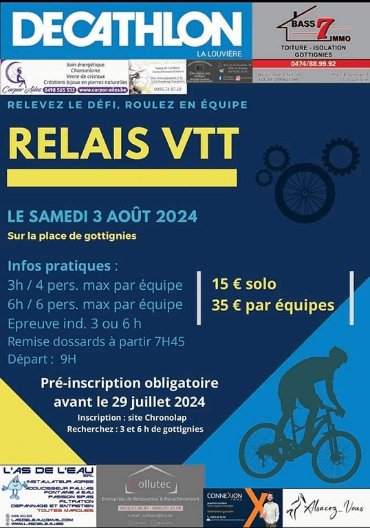 Affiche organisateur. Ce samedi 03 août, une équipe du "VTT TEAM LESSINES" participera à une endurance de 03.00 à GOTTIGNIES (Le Roeulx). Le 06.00 ayant été annulé. Résultats sur "CHRONOLAP". (ci-dessous dès que disponibles)