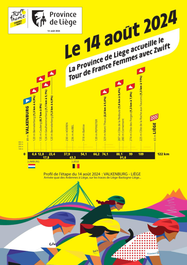 Affiche organisateur. VALKENBURG-LIEGE > 122 KM avec un paquet de côtes mythiques. BASTOGNE-AMNEVILLE > 152 KM plutôt pour les attaquantes. Du 12 au 18 juillet, le "TOUR DE FRANCE FEMMES" passera des PAYS-BAS à la BELGIQUE pour rejoindre la FRANCE. Un TOUR très voyageur. Toutefois, ne nous privons pas de la joie de le voir … Lire la suite PREPAREZ LE « TOUR DE FRANCE FEMMES ». LIEGE (ARRIVEE)-BASTOGNE (DEPART) / BELGIQUE. 14-15/08. INFOS. ▶2024