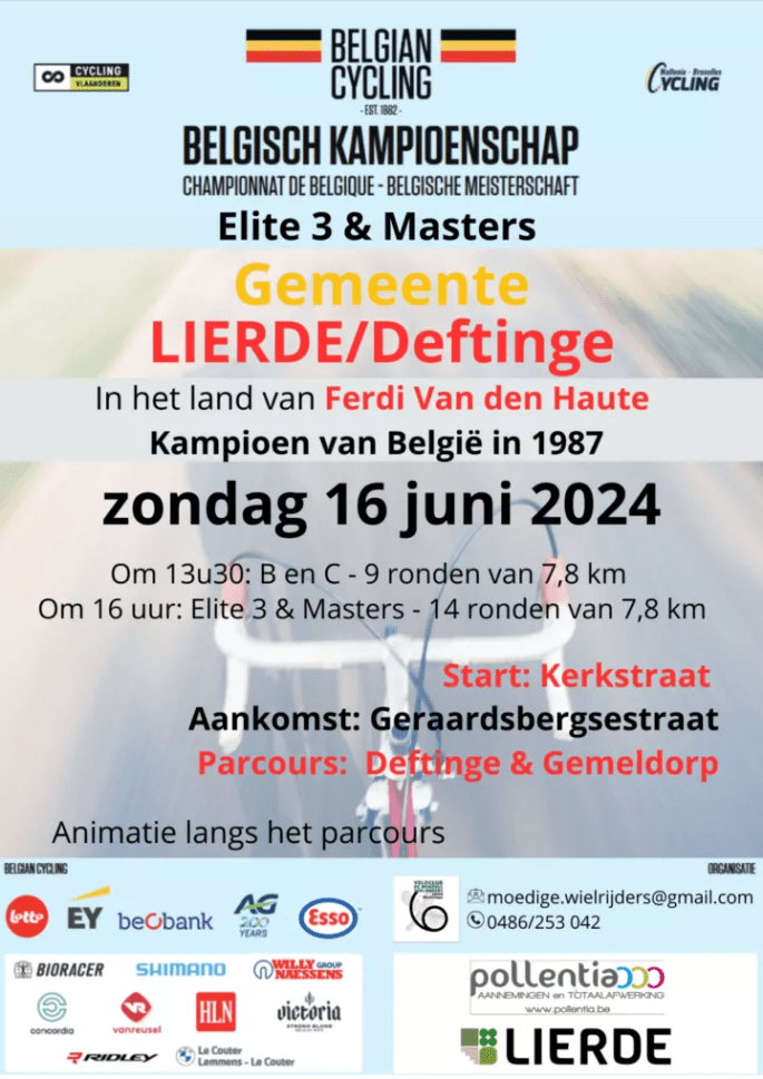 Affiche organisateur. Les ELITES 3 et MASTERS M ont rendez-vous à DEFTINGE (7 km de Lessines) en date du 16 juin pour leur CHAMPIONNAT DE BELGIQUE. Toutes les infos sont sur l'affiche d'entête. EL 3 : Départ à 16.00 MASTERS : Départ à 13.30 Vous aurez l'opportunité de voir plusieurs coureurs régionaux et d'autres qui … Lire la suite « CHAMPIONNAT DE BELGIQUE ». EL3/MASTERS. DEFTINGE. 16/06. INFOS. ▶2024