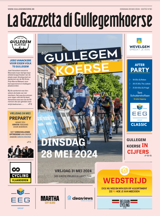 Affiche organisateur. Vous pouvez prendre connaissance de la totalité de "LA GAZZETTA" sur le site des organisateurs. Une quinzaine de pages très instructives avec des photos d'époque - N/B. Plus que jamais, la "GULLEGEM KOERSE" - KERMESSE PRO - va attirer la foule. De grands noms sont - annoncés - par l'organisateur. Il s'agira de … Lire la suite « 80e GULLEGEM KOERSE – EEG CLASSIC ». 28/05. INFOS. + RESULTAT. ▶2024