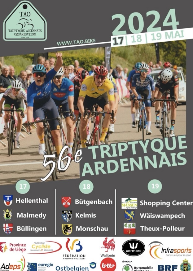Affiche organisateur. Un peloton international est sur les routes ardennaises. Trois jours de luttes intenses pour remporter un "TRIPTYQUE" que de nombreux coureurs envient. Etapes : HELLENTHAL-MALMEDY - 149,8 km BUTGENBACH-LA CALAMINE - 142 km CENTRE COMMERCIAL MASSEN-THEUX - 155,4 km Participants. 161P (en bref) ROTH-CORSUS-VANTHOURENHOUT-VAN DEN BOSSCHE A-DOCKX-GRAFF-GIRMAY-VIDTS-JACQUES L-LAMBRECHT-WERTZ-MELOTTE-DE CEUSTER-YAKOVLEV-VAN BYLEN-DE VET-KUYPERS M-GRAVE-DE BOCK-ALLARD-MICHEL-LAURENT-VAN … Lire la suite TROIS JOURS DE « TRIPTYQUE ARDENNAIS ». 2.12. EL AC/SC et ESP. 17/18/19-05. + RESULTATS. ▶2024
