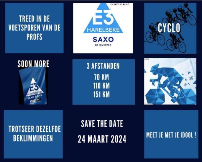 Affiche organisateur. Que dire à propos du "TOUR DES FLANDRES" ? Tout a déjà tellement été écrit ou filmé. Et ce n'est pas terminé ... . Toute cette semaine (soirée), "SPORZA" refait le monde !!! Le "RONDE" est un symbole pour la Flandre. Cette compétition a souvent été copiée mais personne ne l'a jamais égalée. … Lire la suite « RONDE VAN VLAANDEREN ». WT-D/M. 31/03. INFOS. ▶2024