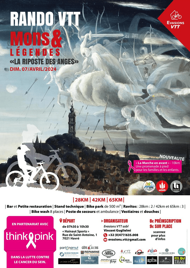 Affiche organisateur. La journée VTT "MONS ET LÉGENDES - LA RIPOSTE DES ANGES" est annoncée à la date du 07 avril. A "HAINAUT SPORTS" à HAVRE !!! Toutes informations sur l'affiche. Pour des renseignements complémentaires voyez la page de l'ASBL "EVASIONS VTT". + MARCHE de 10 km - avec "THINK PINK". Une organisation "FFBC".