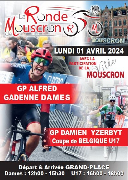 Affiche organisateur. MOUSCRON sera en fête le 01 avril 2024. En effet, deux épreuves importantes se tiendront dans la cité des Hurlus. "LA RONDE DE MOUSCRON". 1. "LE GP ALFRED GADENNE" 1.1 pour dames. 2. Une manche de la Coupe de Belgique pour débutants : "GP DAMIEN YZERBYT". Modalités pratiques : Dames. 122.5 km Présentation … Lire la suite « LA RONDE DE MOUSCRON ». 1.1 Dames ET CoupeBelgique DEB. 01/04. INFOS.▶2024