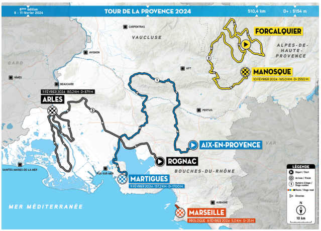 Carte du dossier de presse de l'organisateur. En février, le calendrier commence à se préciser - Europe. Dès le 08 février, le "TOUR DE LA PROVENCE" 2.1 - prendra son envol de MARSEILLE. Quatre étapes plus tard, il atterrira à ARLES. Du solide !! Un renouveau après l'annulation de 2023. Parcours. En entête. Etapes. 08 … Lire la suite « TOUR DE LA PROVENCE ». 08-11/02 +Résultats ▶2024