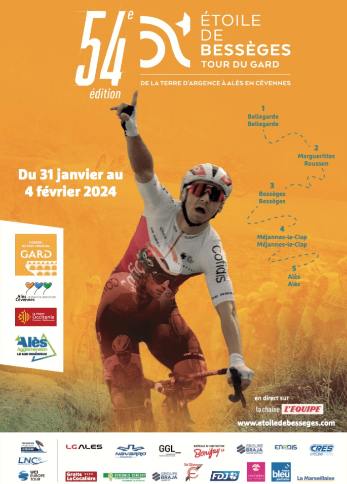 Affiche organisateur. 📣 "L'ETOILE DE BESSEGES" 2.1 - se déroule du 31 janvier au 04 février dans le Département du Gard. L'étape 1 vient d'être annulée. L'Autorité Administrative a pris cette décision au grand regret des organisateurs et des agriculteurs. Ainsi que des supporters !!! Souhaitons courage et persévérance au comité. Dès l'étape 2, vous … Lire la suite « L’ETOILE DE BESSÈGES ». 31/01-04/02. +Classements ▶2024