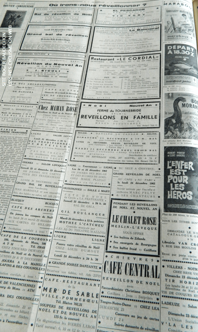 📷 De "LCOW". Journal "LE POSTILLON" de 1962. Durant les Vacances de Noël, "LCOW" ne fermera pas totalement ses pages. Des retours sont envisagés. (Cyclo-cross/Beach races/Autres activités + Archives/Fiches vélos/Accessoires) En entête, une pleine feuille de publicités : "LE POSTILLON" + "L'HEBDO" + "L'ECHO DE LA DENDRE" étaient (mieux que) des réseaux sociaux avant l'heure … Lire la suite « OÙ IRONS-NOUS REVEILLONNER ? ». 1962. ▶2024