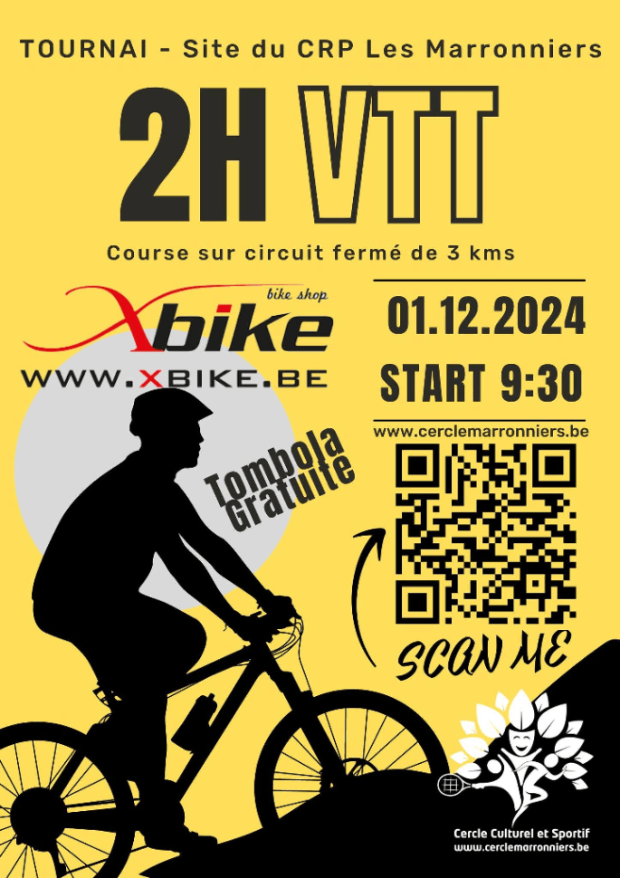 Affiche organisateur. Le "CERCLE CULTUREL ET SPORTIF" des MARRONNIERS - TOURNAI - organise une endurance VTT de 01.00 pour les U10 à U15 et une de 02.00 pour les adultes. Le tout, aux abords du FAUBOURG DE VALENCIENNES (vers Saint-Maur ou Bruyelle). Départ à 09.30. INSCRIPTIONS OBLIGATOIRES. Voir page FB de l'organisateur. Assister ou rouler, … Lire la suite « ENDURANCE VTT DU CERCLE » A TOURNAI. INFOS. 01/12. + RESULTATS. ▶2024