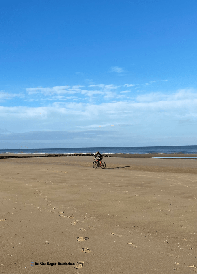 A la côte belge, la pratique du cyclisme sur la plage n'est autorisée qu'à certaines périodes de l'année. Après le mois de septembre vous pouvez y aller gaiement!!! ⚠️ Chaque ville possède sa propre réglementation !!! 📱De Site Roger Baudechon 2025. La semaine dernière. Tout au bout, c'est Ostende (+/- 7 km). L'entrée du port.