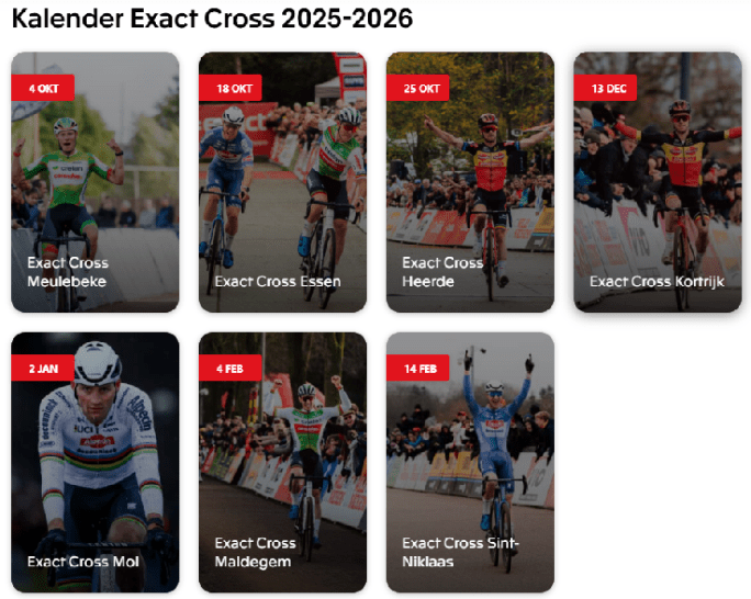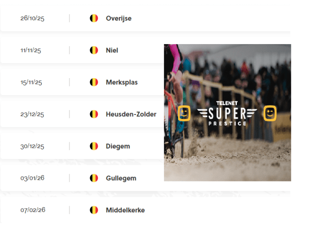 Affiche organisateur. Provisoire - en attente de la définitive. Nous entrons dans la période la plus attendue des amateurs de labourés. Voici les calendriers (chacun une page) de la saison 2025-2026. Il est reproduit et mis à jour en colonne de droite de ce site. "TELENET SUPERPRESTIGE" (Les résultats font quelques fois l'objet d'une page). … Lire la suite « TELENET SUPERPRESTIGE ». CALENDRIER/KALENDER. SAISON 2025-2026.
